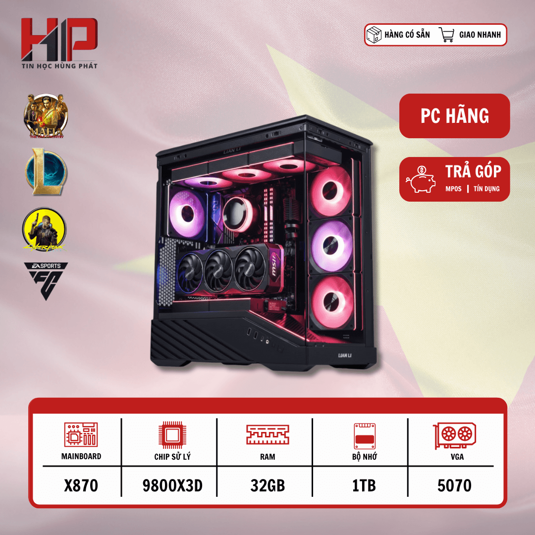 Với sức mạnh từ AMD Ryzen 7 9800X3D, card đồ họa RTX 5070, RAM DDR5 32GB cùng ổ cứng SSD PCIe 4.0 1TB, chiếc PC này mang đến khả năng xử lý mượt mà mọi tựa game AAA cũng như các phần mềm đồ họa và dựng hình nặng nề.