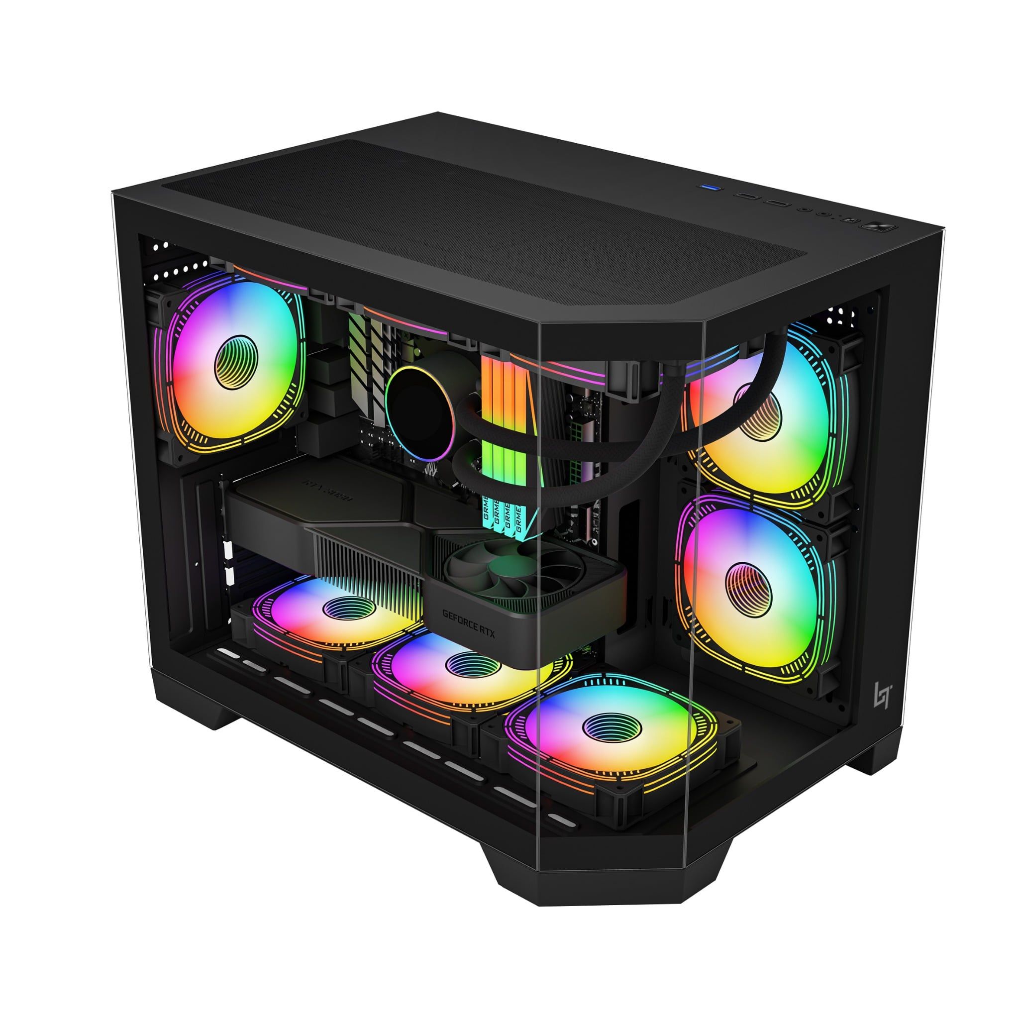 Khung case sử dụng thép SPCC chắc chắn, đảm bảo độ cứng cáp và ổn định khi gắn linh kiện nặng như VGA cao cấp hoặc radiator lớn. Bên trong case có không gian đủ rộng để đi dây nguồn gọn gàng, giúp tổng thể build sạch sẽ, tối ưu airflow và nâng cao tính thẩm mỹ khi nhìn qua các mặt kính.